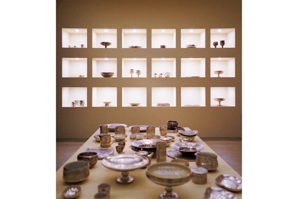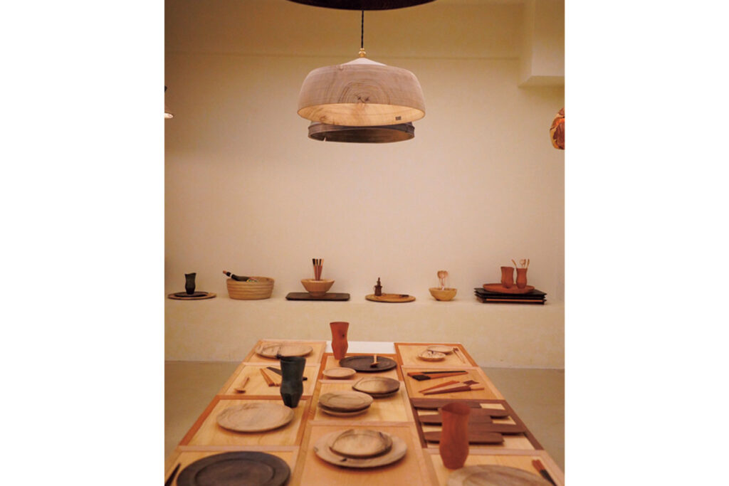 洞窟のように包み込まれる静かな空間に、18の棚が壁と一体化するように並ぶ。一点ものの手工芸やプロダクトが主役になるよう、光をそれぞれに当てている。「棚に飾る際は、このように色や形のリズムを合わせるとまとまりが出ます(木本さん)」。