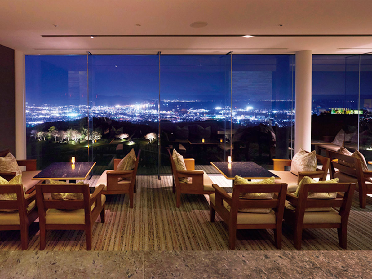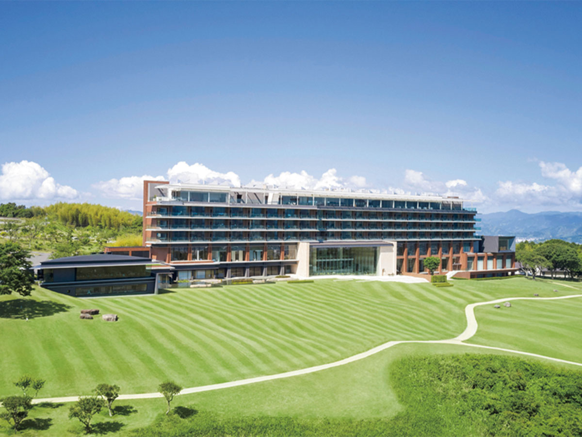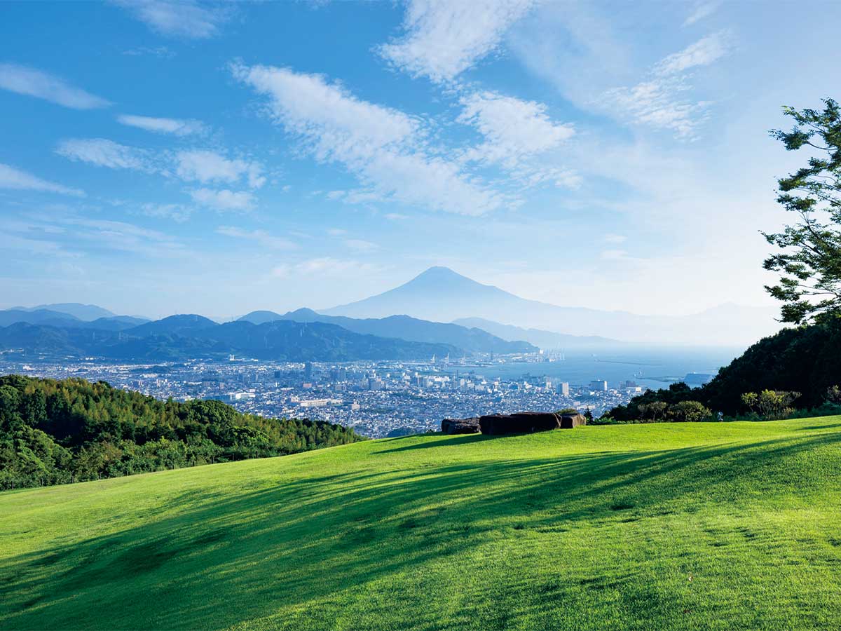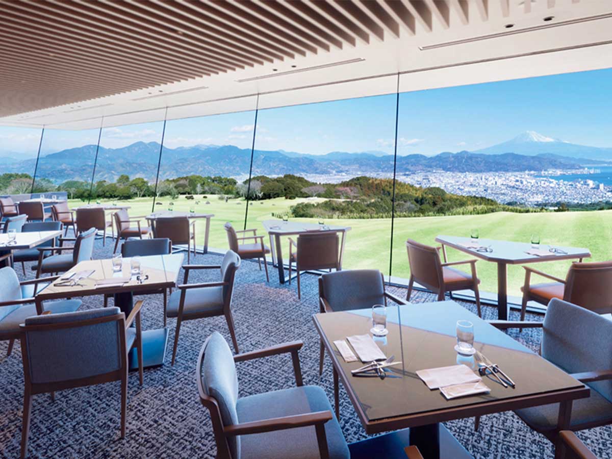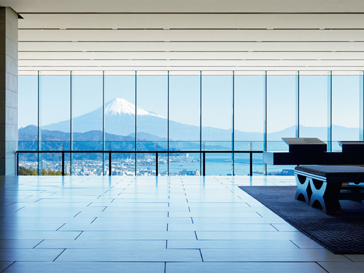 静岡・日本平の丘の上に建ち、目の前には雄大な富士山と駿河湾を一望。視界いっぱいに広がる芝生庭園と空が作る開放感が圧巻で、ガラス張りのロビーからも絶景が楽しめる設計。