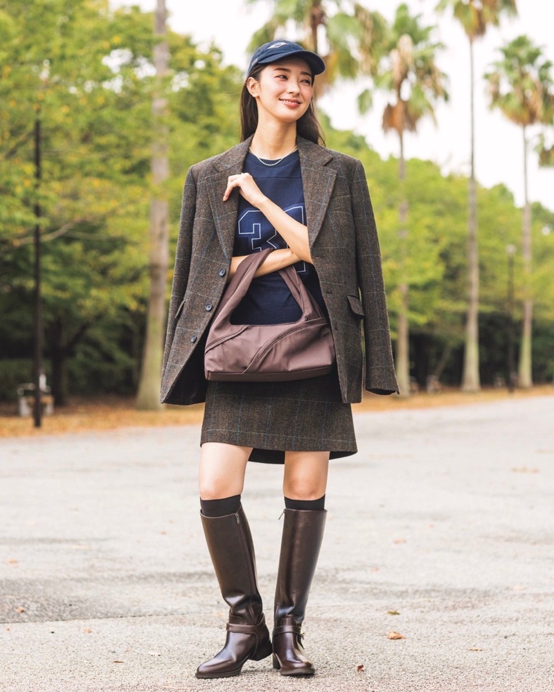 ベスト[メンズ]¥19,250(ザ・ノース・フェイス/ゴールドウイン カスタマーサービスセンター)ニット¥24,200(セット/ジャパンブルー)パンツ¥71,500(ATON/エイトン青山)ピアス¥14,300(ル ボンボン/フーブス)バッグ¥60,500(ア ヴァケーション/ノーベルバ)ブーツ¥31,900(ダイアナ/ダイアナ 銀座本店)
