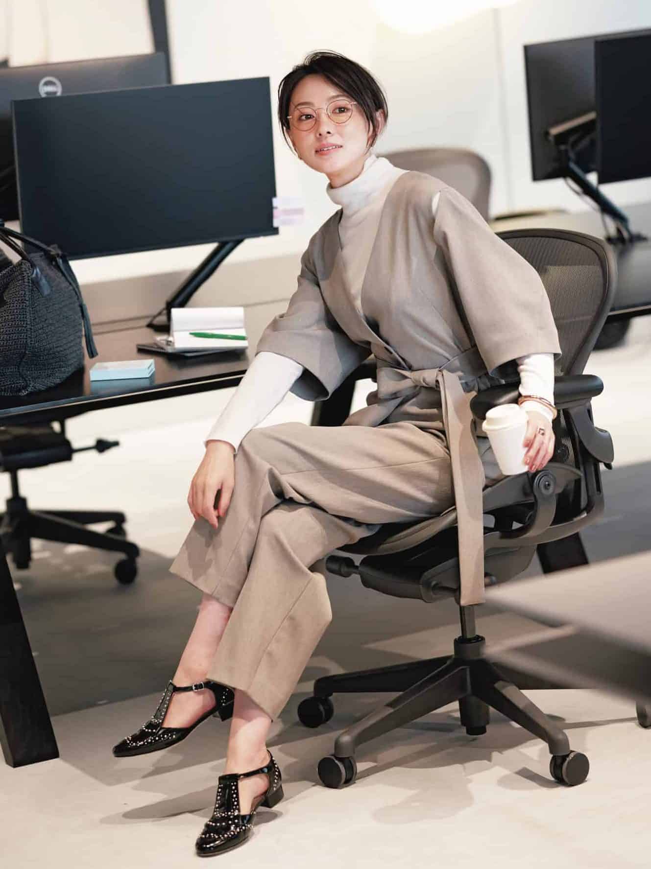 タイトスカートは視線が気になり、ふんわりスカートは立ったり座ったりに適さなそう。スッキリシルエットながらラインを拾わないタックスカートが使えます。