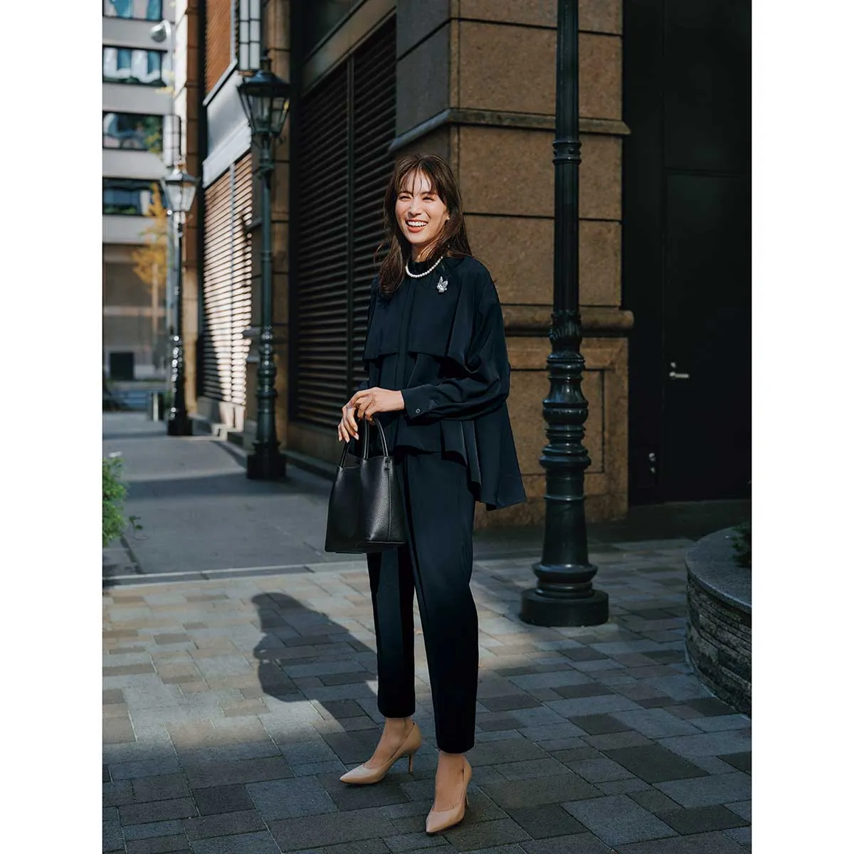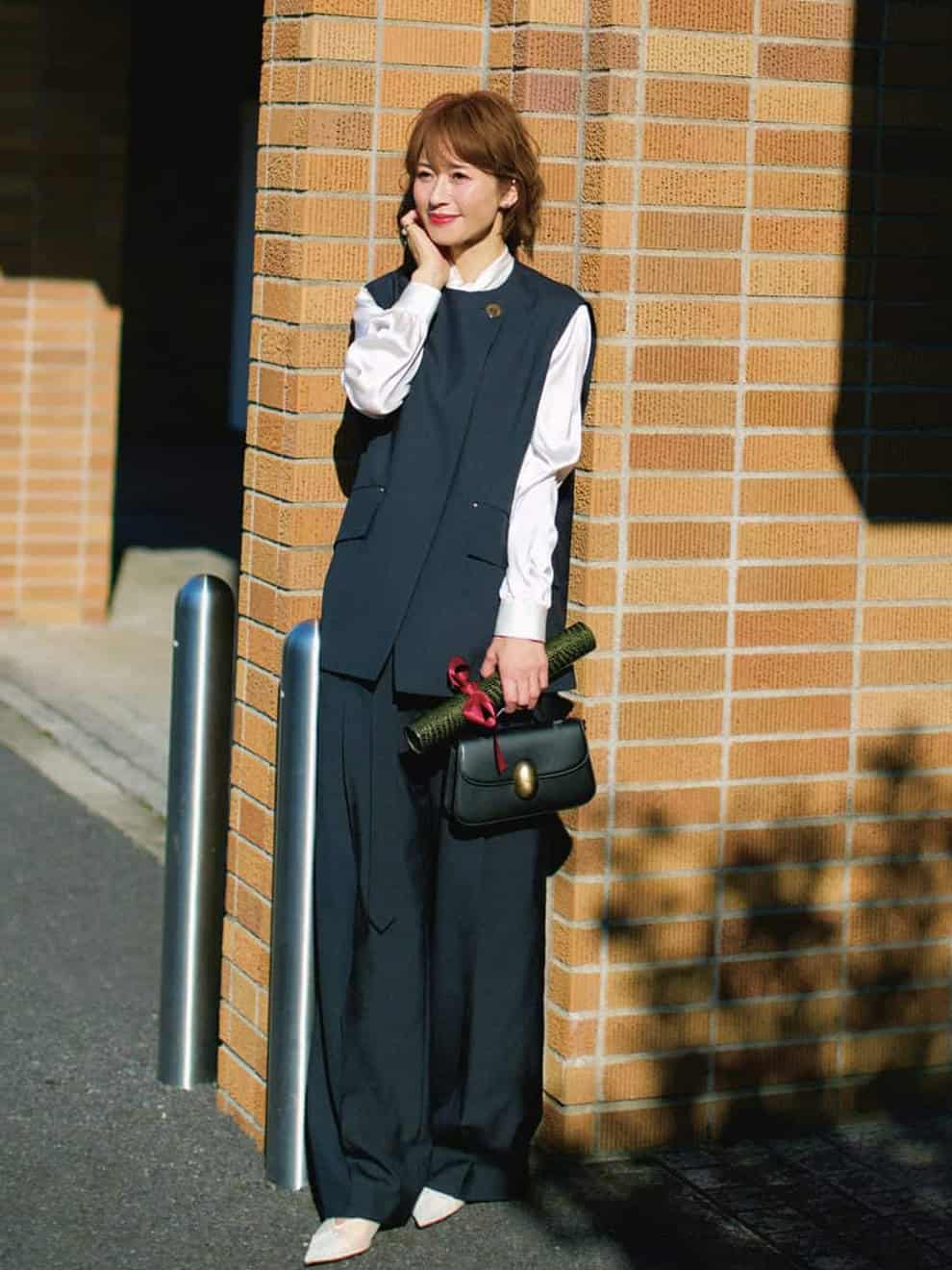 ジレ¥25,300(カデュネ)ブラウス¥26,950(ローブ スーペリアクローゼット/フランドルカスタマーサービス)パンツ¥48,400(ハイク/ボウルズ)バッグ¥63,800(ヴァジック/ヴァジックジャパン)パンプス¥108,900(ジャンヴィト ロッシ/ジャンヴィト ロッシ ジャパン)ピアス¥52,800(MAAYA)