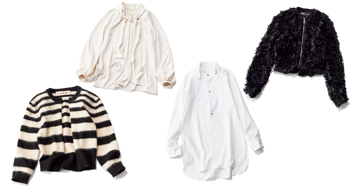 透け感のある黒にあえて白のインナー合わせで隠さず〝見せブラ〟風に挑戦するなら夕飲みがチャンス。ランジェリーインナーのリボンでバックシャンなスタイルが完成。