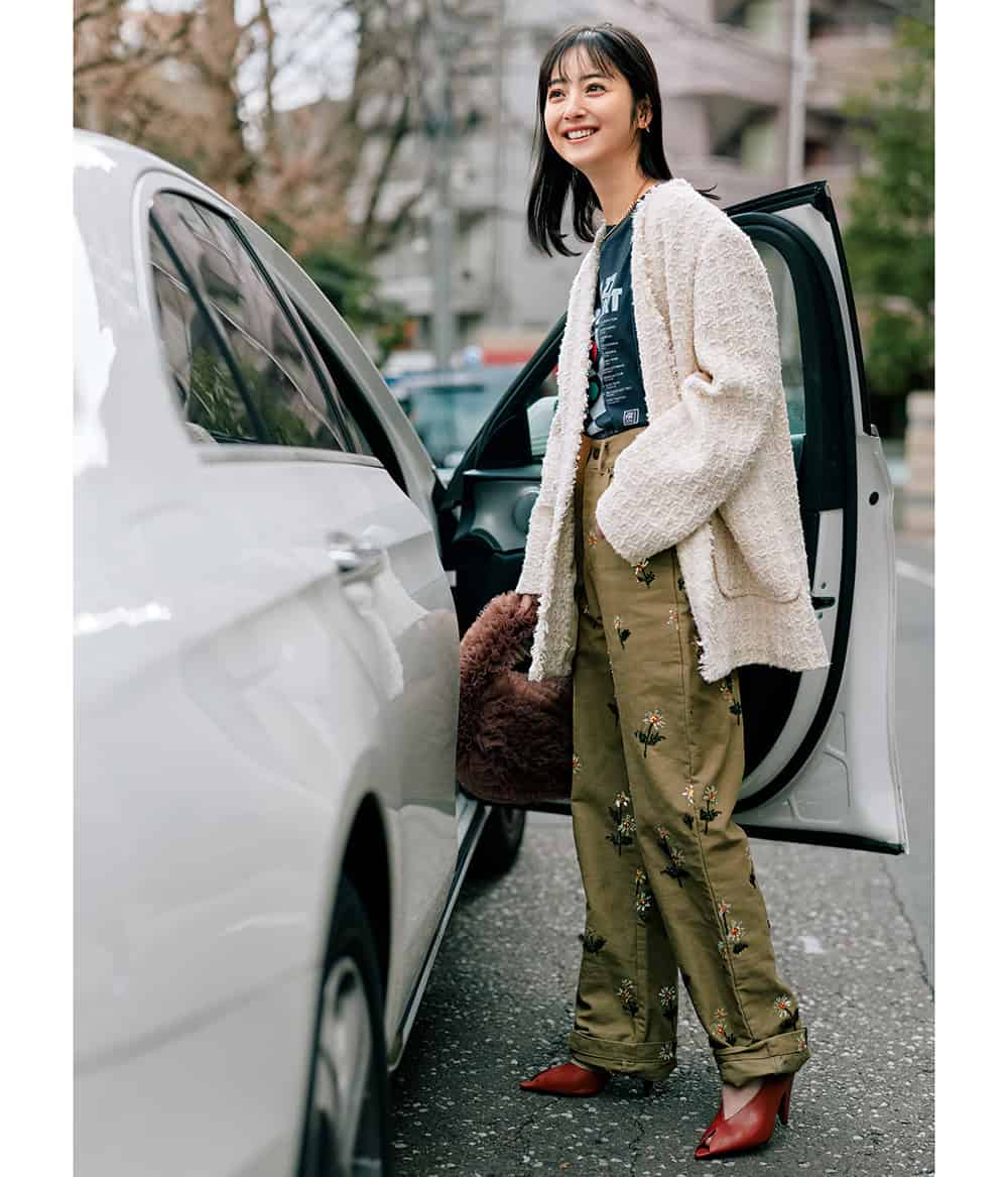 トップス¥25,300(ウィム ガゼット/ウィムガゼット ルミネ新宿店)パンツ¥19,800(アルページュストーリー/アルページュストーリープレスルーム)バッグ¥7,990(Gap)パンプス¥64,900(ネブローニ)サングラス¥50,600(アイヴァン/アイヴァン 東京ギャラリー)ブレスレット¥14,300イヤリング¥7,920(ともにイットアトリエ/フォーティーン ショールーム)