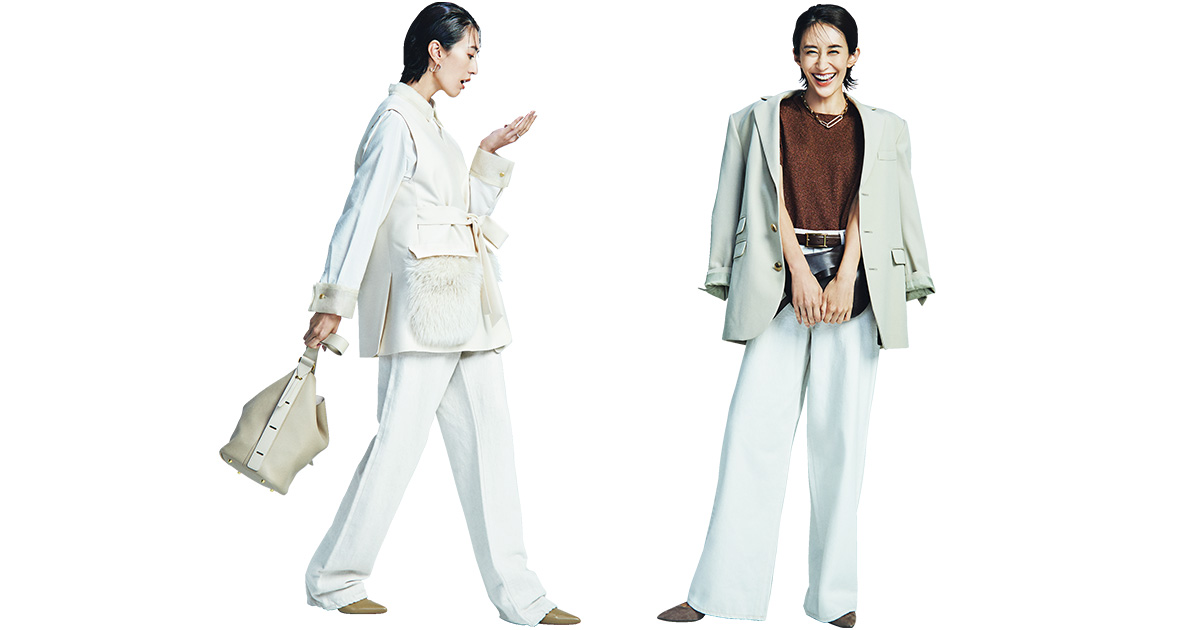 「まだ下の子が4歳なので、1人時間に白パンツやヒールを履けることが嬉しいんです」持ち前のシャープなシルエットは、大人なレディを作ります。ピンクを効かせたトラッドスタイルでキャラ変。遊び心を高めながらエレガントなスタイルを更新。