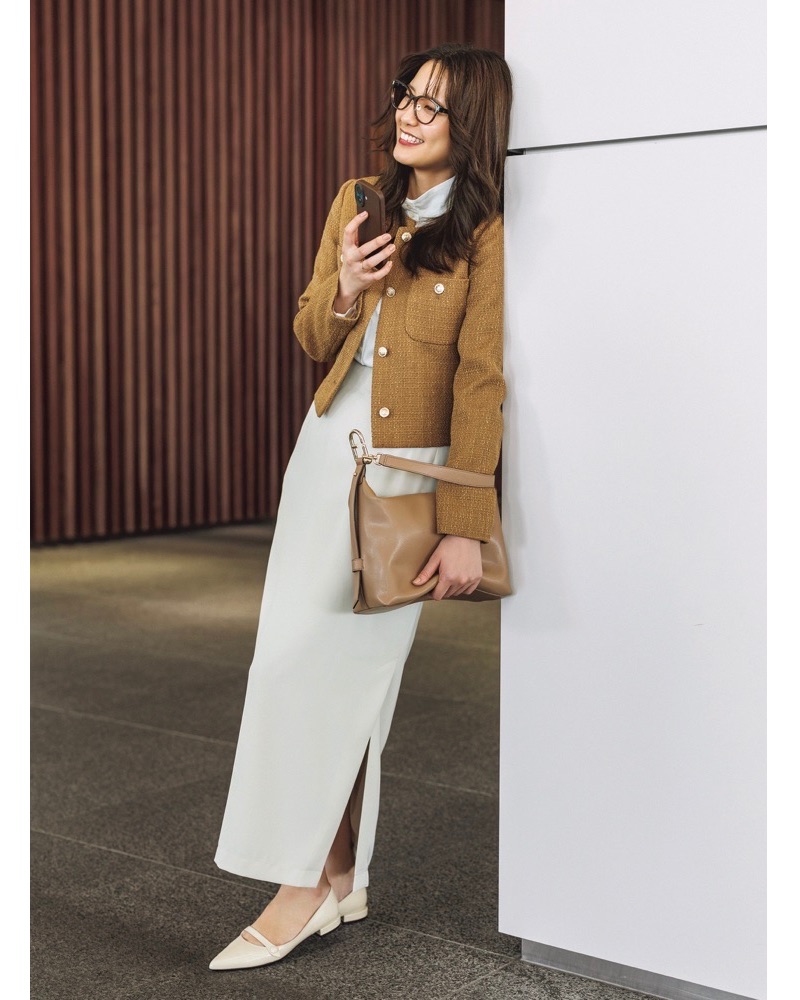 ワンピース¥15,400ジャケット¥22,000ブローチ¥4,950(すべてマルゥ ユナイテッドアローズ╱ユナイテッドアローズ カスタマーサービスデスク)ピアス¥124,300(ヴァンドーム青山╱ヴァンドーム青山 プルミエール 伊勢丹新宿店)バングル¥24,200(プラス ヴァンドーム)バッグ¥68,200(メゾン カナウ╱ヤマニ)サブバッグ¥13,200(シャルマントサック)シューズ¥44,000(パープレッド)