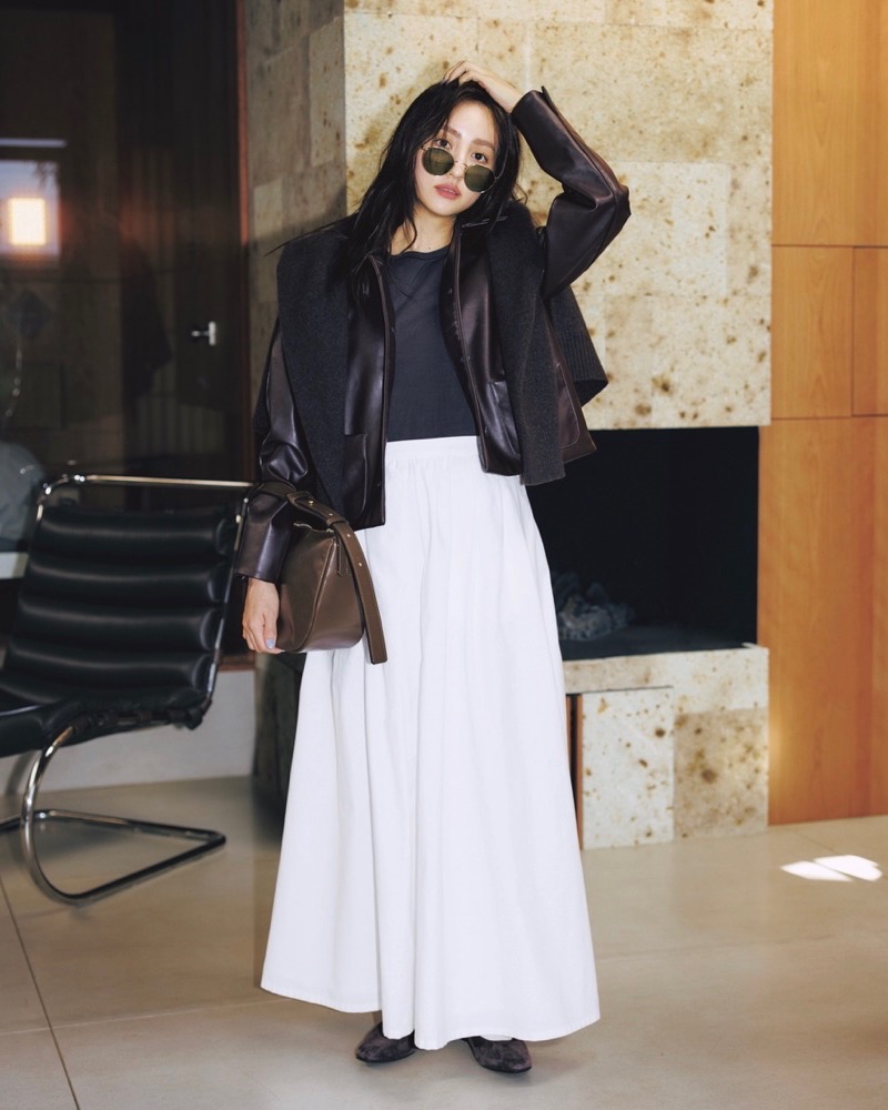 白のシアートップスに頼れば今っぽさもヘルシーな透け感も一挙両得。オフィスではジャケットを羽織って肌感をコントロールするのも手。ジャケット¥187,000(ロエフ/エイチ ビューティー&ユース)カットソー¥19,910(アストラット/ユナイテッドアローズ 六本木ヒルズ店)スカート¥26,400(ランバン オンブルー/ランバン オンブルー)バッグ¥104,500ピアス¥39,600リング¥37,400 (すべてメゾンヴァジック/ヴァジックジャパン)靴¥59,400(ビューティフル シューズ/オーセンティック シュー&コー)ソックス[スタイリスト私物]